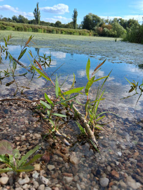 In der Mulde schwimmt ein Weidenzweig, der vermutlich von einem Biber abgenagt worden ist. Im Wasser hat er wieder ausgetrieben. Das ist ein Beispiel dafür, wie Biber dazu beitragen, dass sich Weiden in Ufernähe ansiedeln und vermehren können.